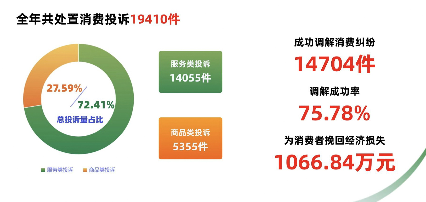 2024年,全市消保委及有关成员单位以习近平新时代中国特色社会主义思想为指导,聚焦“优化消费环境,激发消费活力”和助力高水平建设现代海洋城市目标,全面践行“以人民为中心”理念,借鉴发展“枫桥经验”,多元化解消费矛盾纠纷。全年共处置消费投诉19410件,其中商品类投诉5355件,占总投诉量27.59% ,服务类投诉14055件,占总投诉量72.41%,成功调解消费纠纷14704件,调解成功率75.78% ,为消费者挽回经济损失1066.84万元。